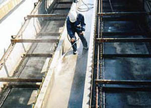 高圧水洗浄状況 劣化したコンクリートや藻などの有機物を清水にて高圧水洗浄機(200)による除去清掃作業。 (注)藻などの有機物を除去するため次亜塩素酸水溶液を散布して殺藻してから洗浄してください。 ※藻などの有機物が残っていると塗膜の膨れの原因になります。