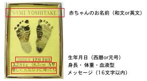 プレートには足形だけでなく、「赤ちゃんのお名前(和文or英文)」「生年月日(西暦or元号)」「身長・体重・血液型」「メッセージ(16文字以内)」が刻印できます。